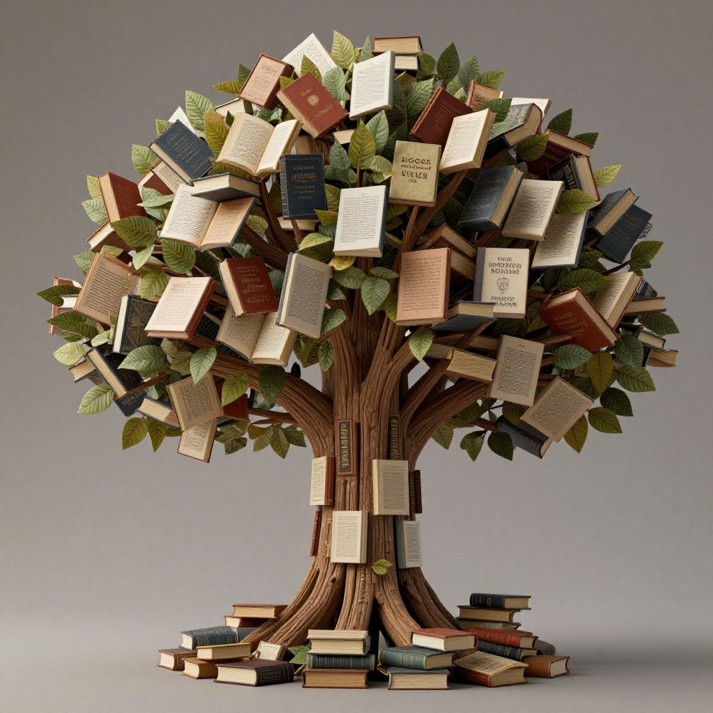 Photograph of a stylized tree with a thick, textured brown trunk and green leaves, adorned with numerous book covers and title pages. The books, in various colors and sizes, are arranged haphazardly among the leaves, giving the tree a dynamic, book-filled appearance. The background is a gradient from light gray to dark gray, providing contrast to the tree. At the base, several stacks of books are piled, adding to the tree's literary theme. The image evokes a sense of knowledge and wisdom, blending natural and literary elements.