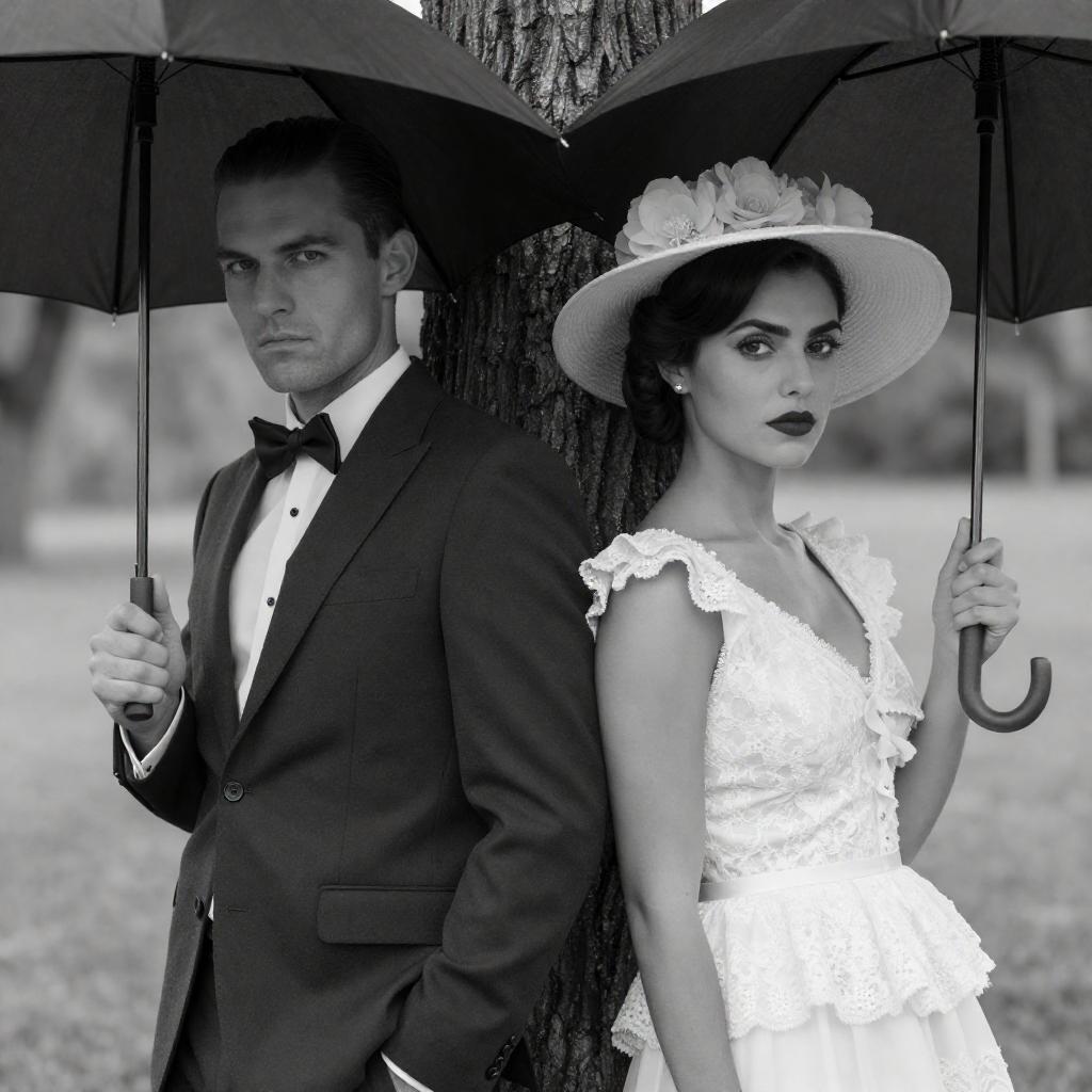 Black-and-white photograph of a man and woman in formal attire. Man with slicked-back hair, dark suit, and bow tie. Woman with dark lipstick, lace dress with frills, and large hat with flowers. They are leaning against a tree, woman's face turned to the right. Man's expression is serious. Woman's expression is intense. Both hold umbrellas. Tree bark ure visible.