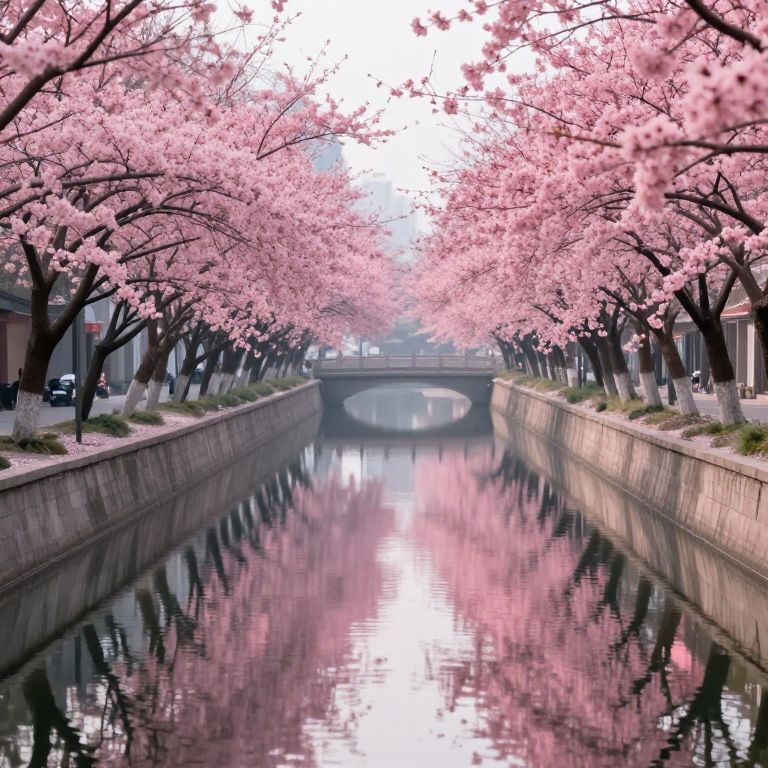 Photograph of a serene canal lined with cherry blossom trees in full bloom. The trees' vibrant pink flowers create a canopy over the water, reflecting their color perfectly in the calm surface. A concrete bridge spans the canal in the background, partially obscured by the blossoms. The canal's concrete banks are flanked by low stone walls and patches of greenery. The sky is overcast, diffusing the light and enhancing the vivid pink of the blossoms. The overall scene exudes tranquility and natural beauty, with the symmetry of the canal and the reflection adding a sense of depth and balance.
