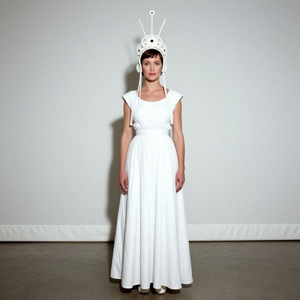 Photograph of a woman standing against a plain white wall and gray floor. She wears a full-length, white, sleeveless dress with a simple, elegant design. Her head is adorned with a white, ornate headdress featuring three vertical, pointed elements and black dots. She has straight, black hair and a neutral expression. The lighting is stark, casting soft shadows. The overall aesthetic is minimalistic and modern, with a focus on the contrasting white outfit and headdress against the plain background. The woman's skin tone is light, and she stands centered in the frame.
