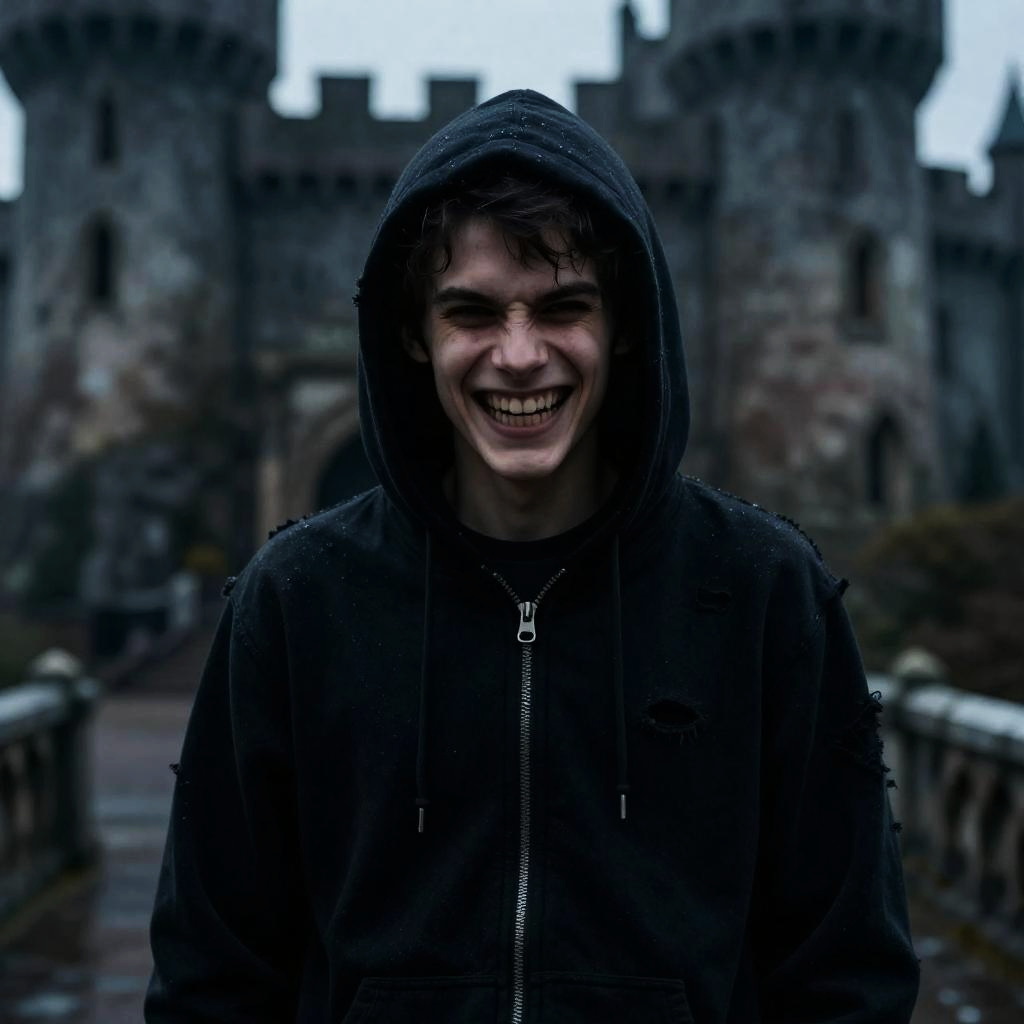 Realistic photo.Ultra-realistic photo of a teenage boy in a torn black hoodie, in a dark, cold old castle setting, wide neckline, psychotic expression with evil laughter, focus on upper body and face, dramatic lighting and wet effect on hoodie, cinematic atmosphere. realistic photo