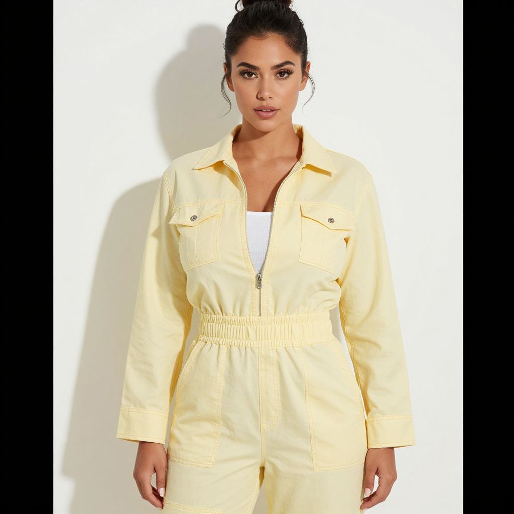 "Woman, casual utility, pale yellow zip-up jumpsuit, short collar, long sleeves with buttoned cuffs, elasticated waistband, straight-leg pants, pockets on chest and hips, visible stitching, white inner tank top visible at neckline, black hair tied up in a casual bun, white background with a soft shadow.. Sexy. Pretty face and beаutiful eyes. Big breasts."