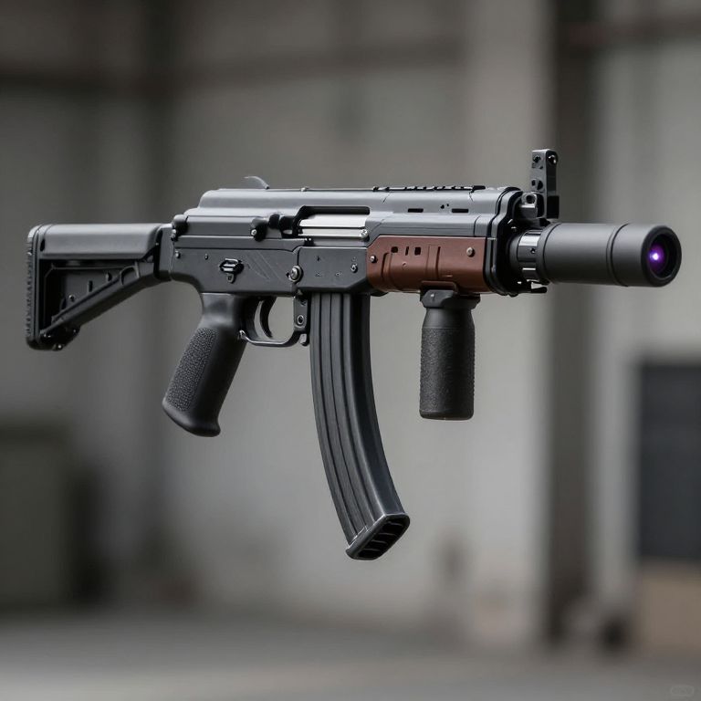 Mp5 modernized weapon, compact with modular attachments, suppressor and laser sight, urban warfare background, realistic lighting, sharp focus on firearm