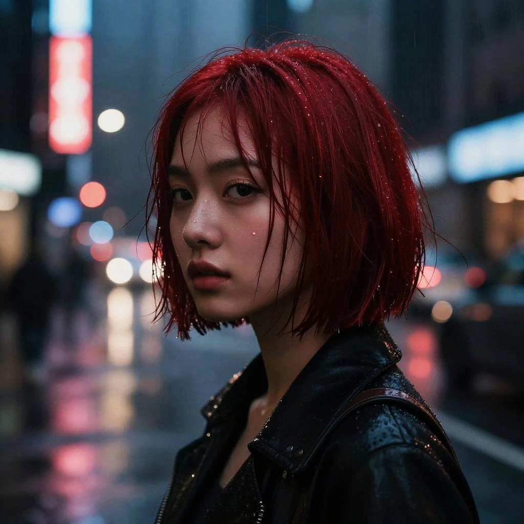 Red bob haircut, rain-soaked city street at night, glistening wet hair strands reflecting neon signs, moody and dramatic atmosphere, detailed water droplets, dark clothing, blurred urban lights background, cinematic style with deep shadows