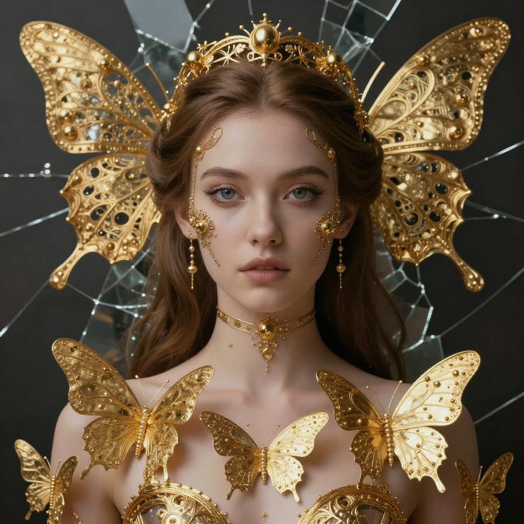Photo, 8k portrait of beautiful cyborg with brown hair, intricate, elegant, highly detailed, majestic, digital photography, art by artgerm and ruan jia and greg rutkowski surreal painting gold butterfly filigree, broken glass, (masterpiece, sidelighting, finely detailed beautiful eyes: 1.2), hdr, realistic, high definition