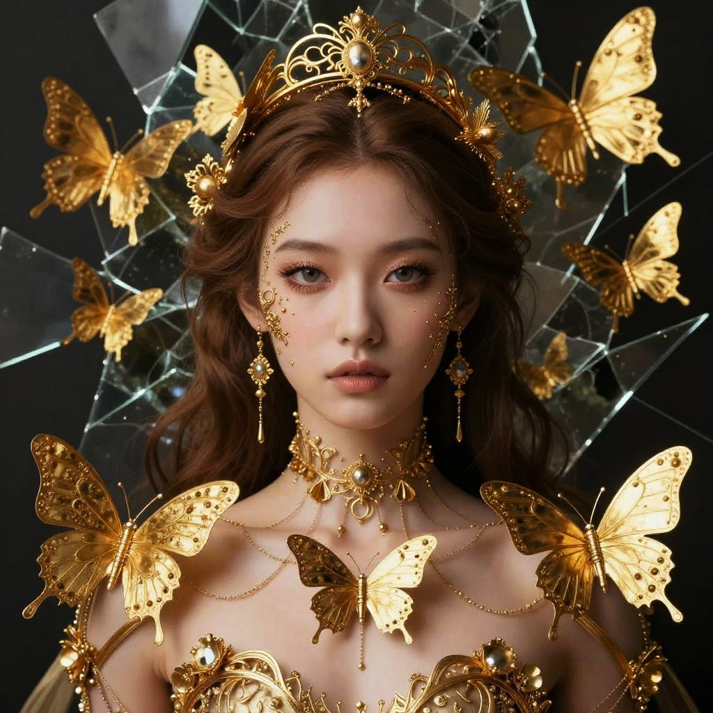 Photorealistic digital artwork of a fair-skinned woman with golden butterfly adornments, intricate headpiece, and detailed facial jewelry, set against a dark