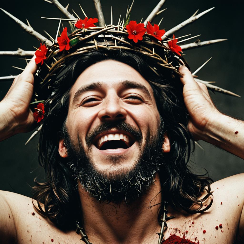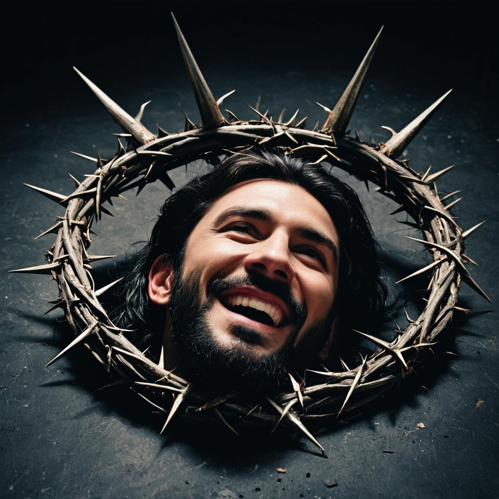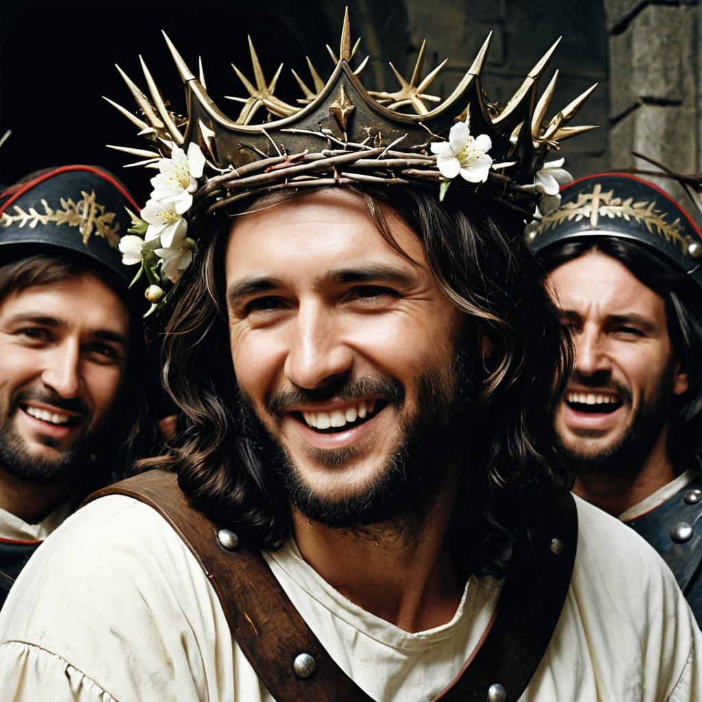 A close-up of a young woman with long dark hair smiling and wearing a crown of thorns being placed on her head by two men. The men wear medieval-style clothing, one with a floral crown and the other with a serious expression. The scene conveys a dramatic and theatrical atmosphere with strong emotional contrast.