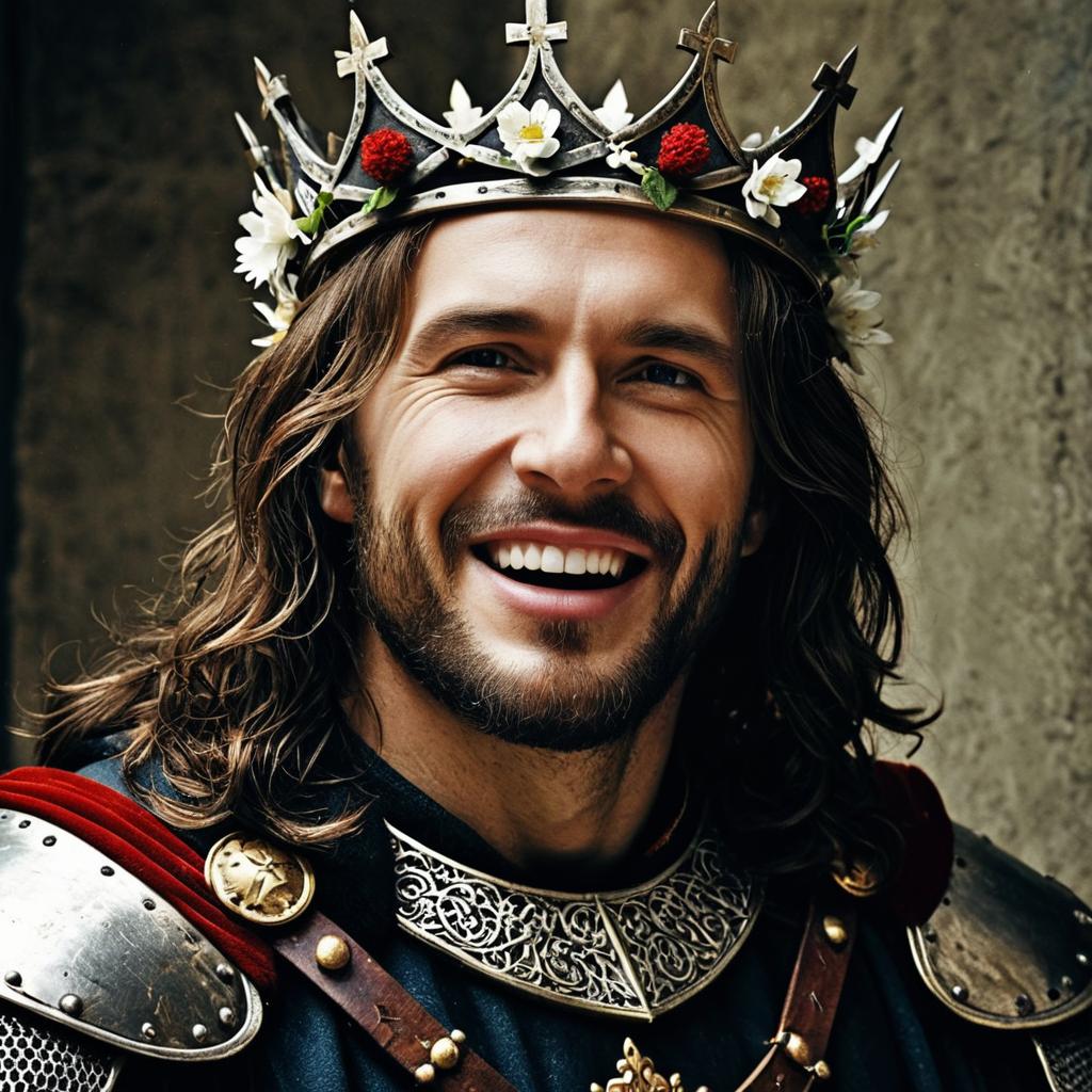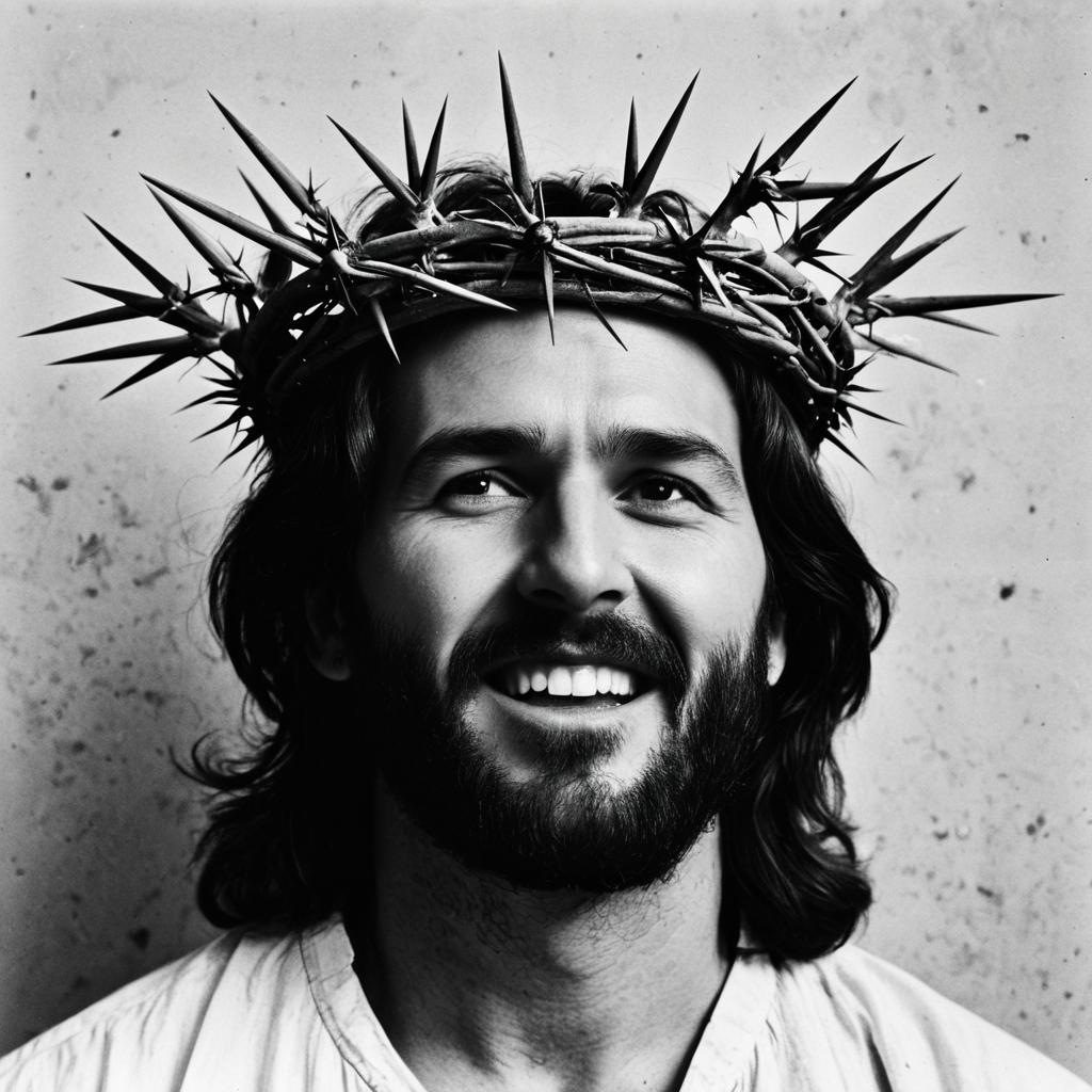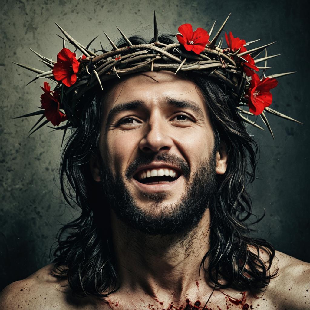 A close-up of a young woman with long dark hair smiling and wearing a crown of thorns being placed on her head by two men. The men wear medieval-style clothing, one with a floral crown and the other with a serious expression. The scene conveys a dramatic and theatrical atmosphere with strong emotional contrast.