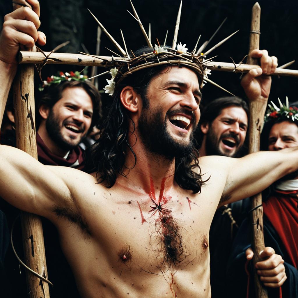 Salome, seductive and tense, courtiers and executioners, Blooming The Passion of the Christ, crown of thorns, suffering looking face, strong sense of realism, mocking and laugh at jesus christ, in the style of still lifes