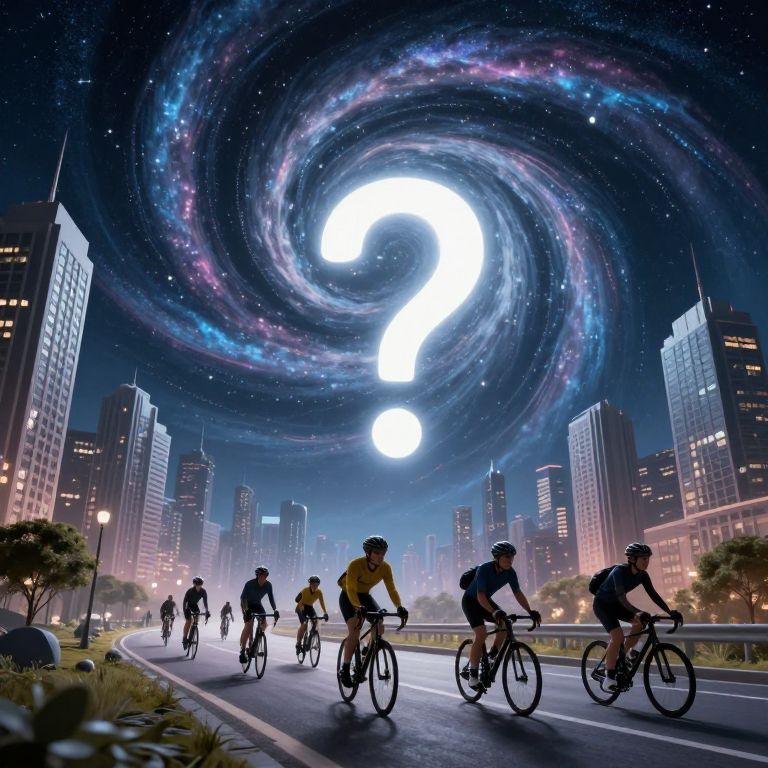 In a surreal cityscape where the heavens twist into a cosmic vortex, cyclists navigate a path of unspoken questions, their wheels spinning not by force but by the weight of curiosity and the silent yearning for answers.