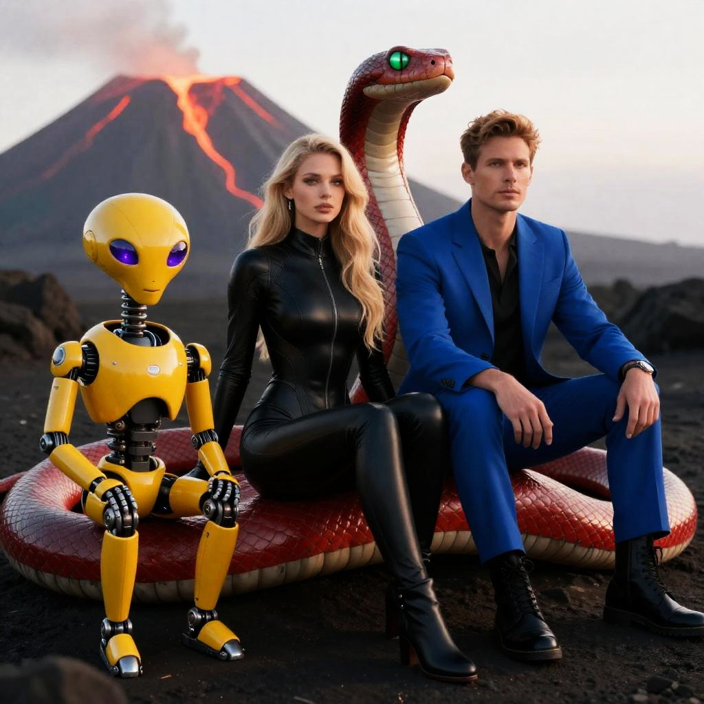 Realistic photo.Functional Art photo of an attractive cyborg couple sitting beside a red robotic snake with green eyes, on the left side is a random yellow robot alien with purple eyes, the woman is looking into the lens, woman has long blonde hair and wears a black modern body fit suit, full body picture, editorial style, man wears a blue modern suit, natural face, active volcano and lava in the background, fog, golden hour, cinematic, futuristic, hyperrealistic. realistic photo