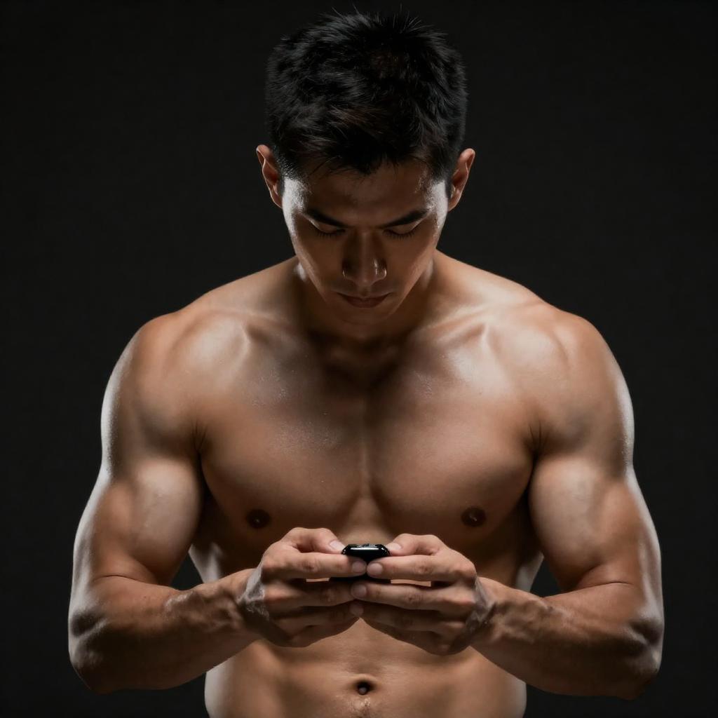 Photograph of a muscular, shirtless man with short, dark hair and light skin, standing against a black background. He has a defined chest and abs, with his right hand raised to his chin and his left hand resting on a shiny metal surface in the foreground. His expression is serious and focused.