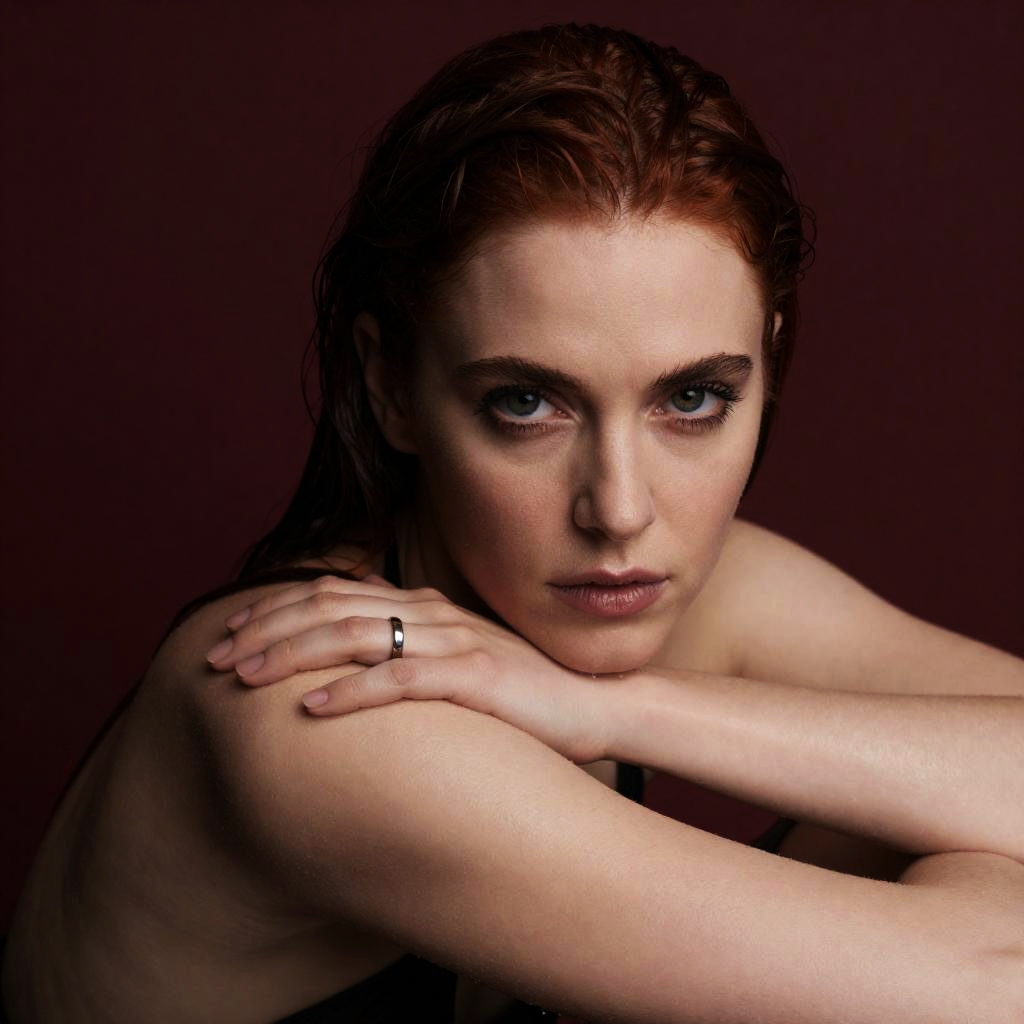 Photograph of a woman with wet, dark red hair, pale skin, and green eyes, leaning on her right arm in a dark, reddish background. She wears a ring on her left hand. Water covers her shoulders. Her expression is neutral.