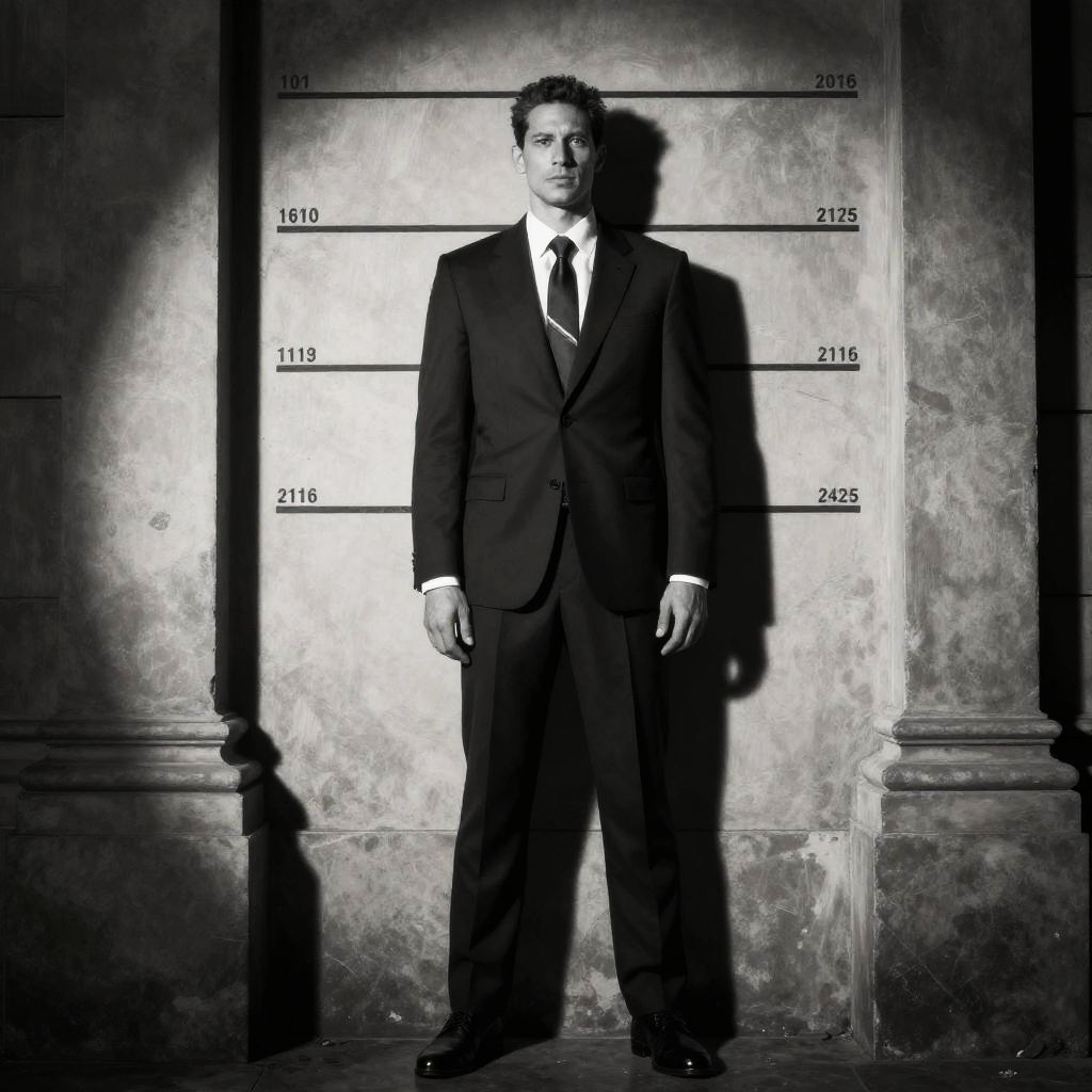 Black-and-white photograph of a serious man in a dark suit, white shirt, and tie, standing against a height measurement wall. High contrast, dramatic