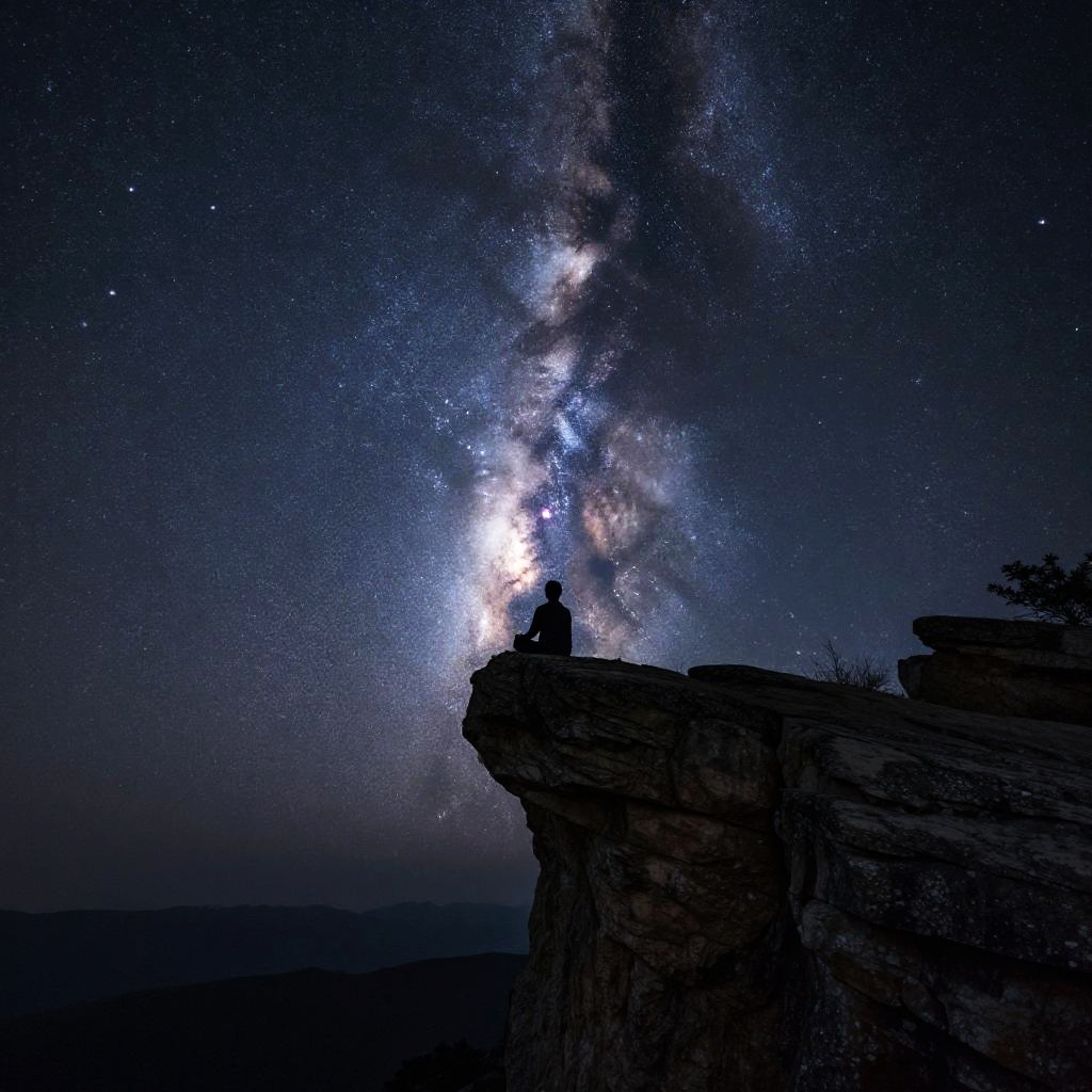 Mountain cliff edge under starry night sky, glowing Milky Way above, silhouette of lone figure meditating, serene and majestic mood, natural textures, ultra realistic details