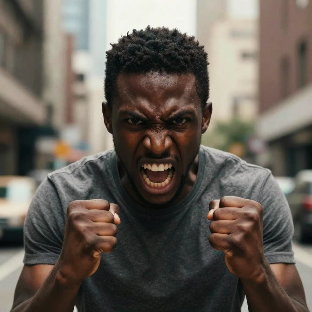 Angry African man with intense expression, clenched fists, dramatic lighting, urban background, detailed skin texture, powerful emotions captured mid-shout, dynamic composition