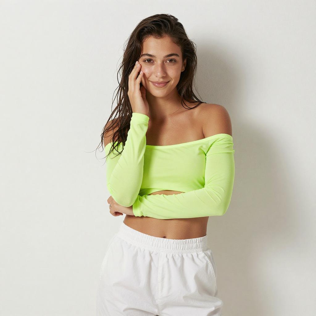 Photograph of a young woman with long, straight brown hair, wearing a tight, bright orange sleeveless top and matching shorts. She is sitting on a white stool, facing slightly to the right, with one hand behind her head. Her expression is neutral, and she has a light olive skin tone. The background is plain white.