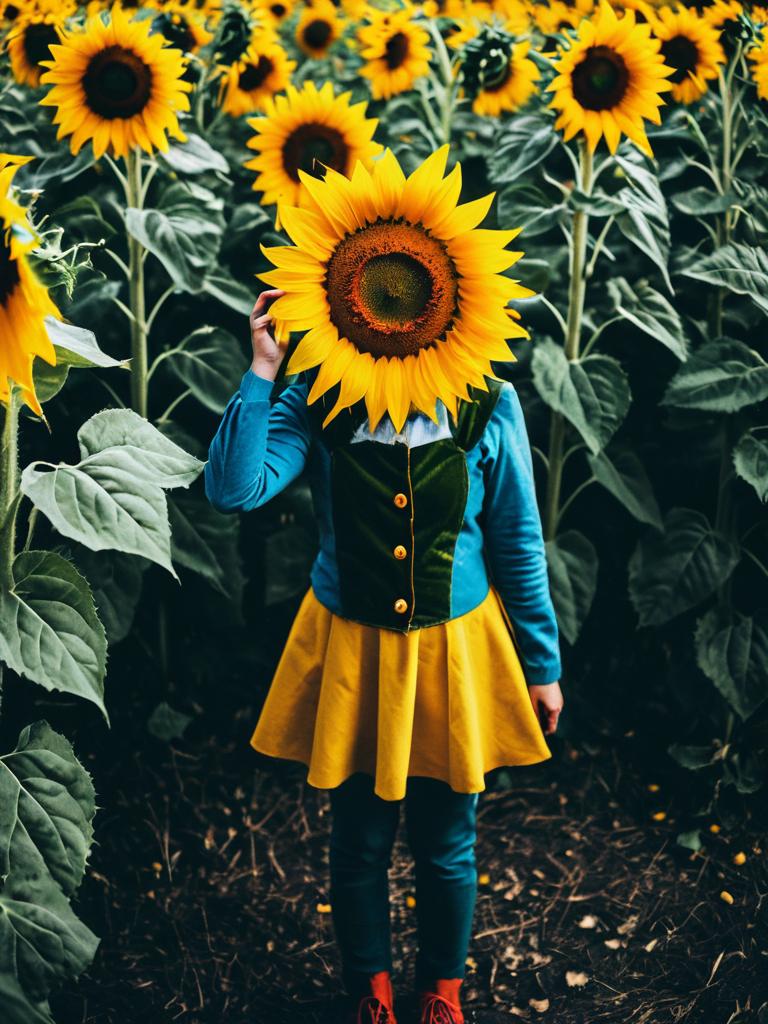 Photo of a person standing in a sunflower field wearing a bright yellow costume with a large sunflower headpiece. The outfit includes a yellow jacket and matching pants with turquoise cuffs. The scene is vivid and colorful with sunflowers and green foliage in the background, producing a cinematic and artistic effect.