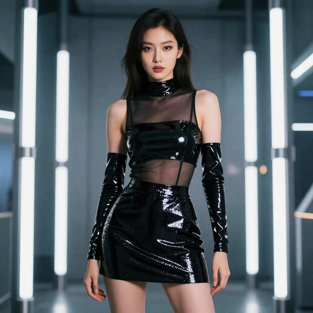 An artistic depiction of a woman in a futuristic setting, showcasing a bold fashion statement with a black, glossy outfit that includes a transparent top and a shimmering skirt, all set against a backdrop of illuminated vertical tubes that enhance the sci-fi ambiance.