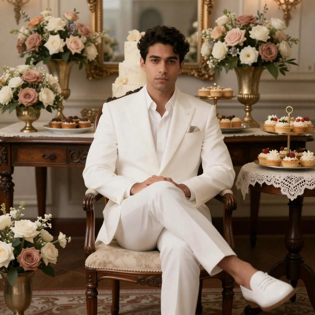 Young man wearing a white suit with crossed legs sitting on an ornate wooden chair in a luxurious room. The background features floral centerpieces with pink and white roses, a tiered white cake, pastries, and rich wooden furniture with lace tablecloth. The atmosphere is elegant and refined.