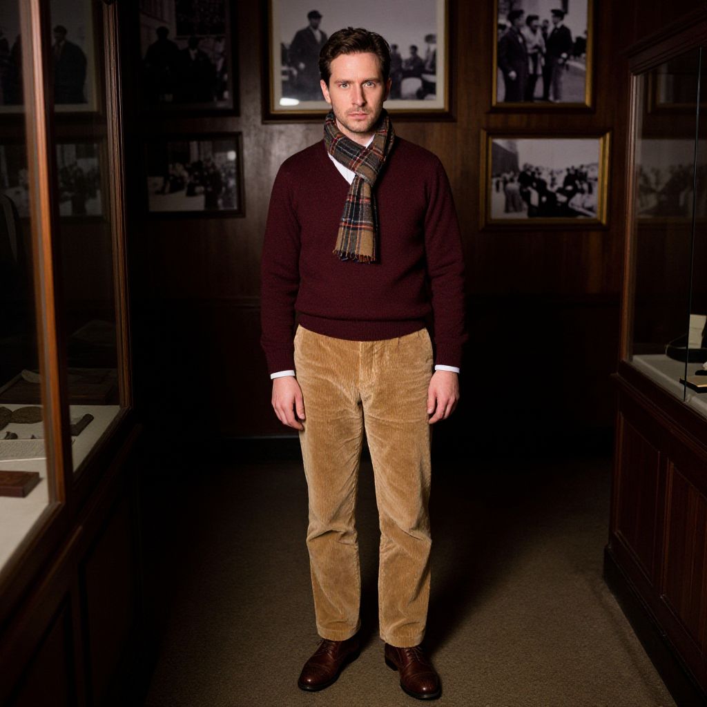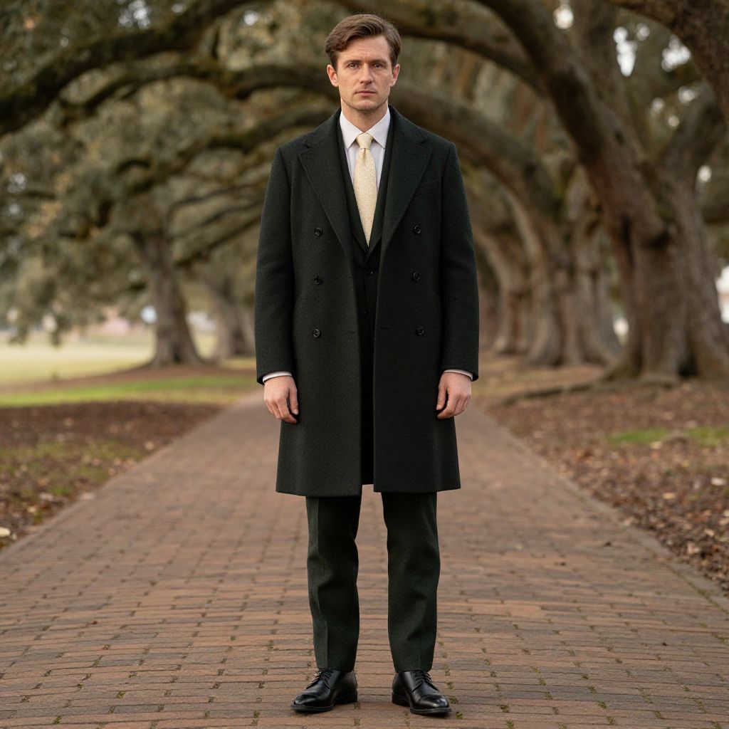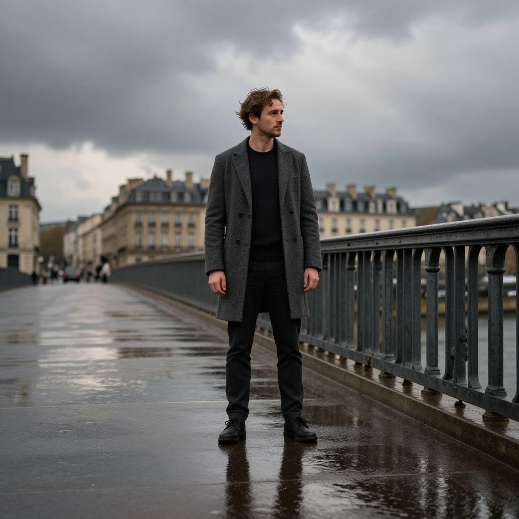 A man, charcoal wool overcoat, black turtleneck sweater, dark gray tailored trousers, black leather boots, textured scarf in deep gray, rustic train station, vintage wooden benches, overgrown wildflowers, calotype process, contemplative expression. Man has masculine face and piercing eyes