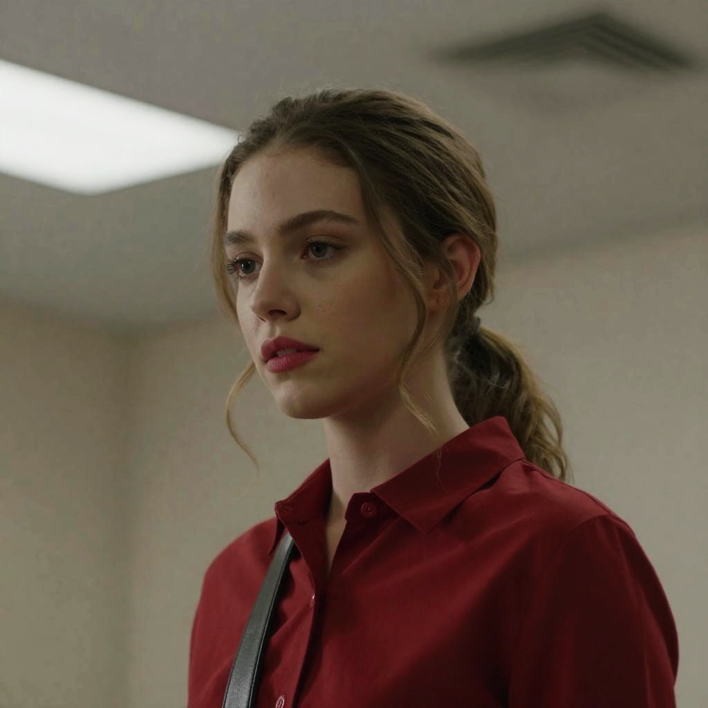 Young woman with blonde hair, wearing plaid dress and brown vest, sits on chair, writing in notebook, against brick wall. Wooden ladder and chalked "WHITE" on wall in background. Dim lighting, serious expression.
