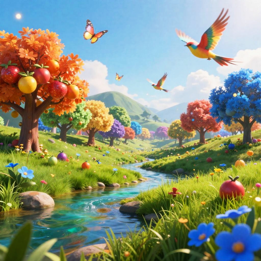 A vibrant fantasy landscape featuring bright green grassy hills and a flowing blue-green stream. The scene is filled with colorful trees bearing glittering fruits, bright blue flowers, luminescent butterflies, and large, colorful birds flying in a bright, clear sky. The environment is richly detailed and surreal, evoking a dreamlike atmosphere with vivid hues and intricate textures.