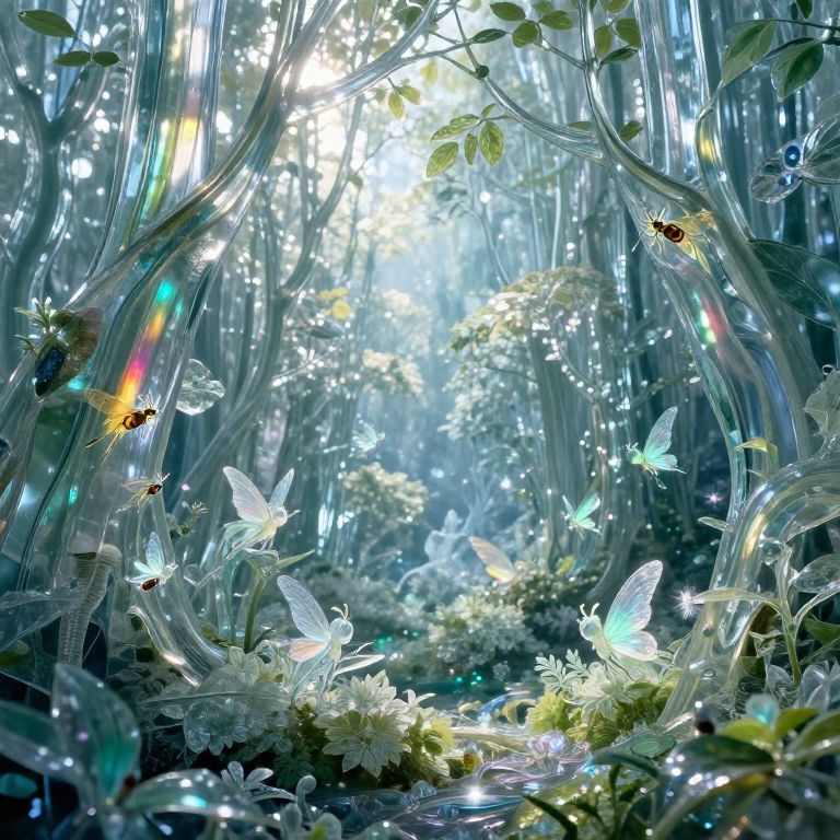 A glassf mystical forest where every leaf and tree is made of sparkling translucent glassf, sunlight refracted in rainbow colors, magical creatures like fairies and glowing insects inhabiting the glassf environment, ethereal and serene mood