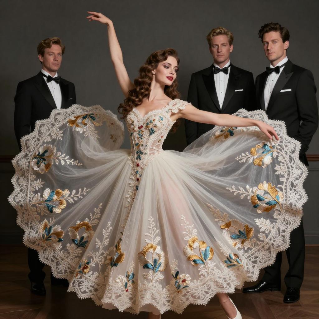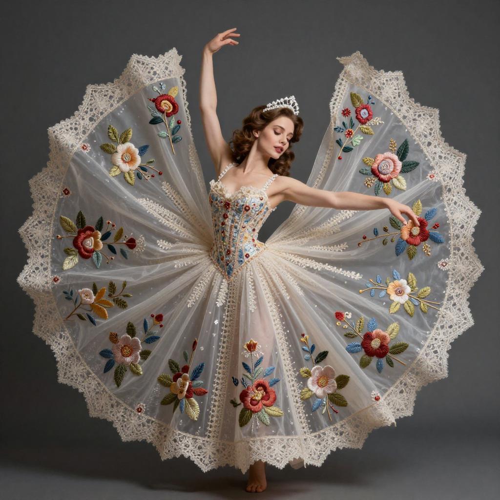 Concept art, 4k, intricate, pinup, a woman, beautiful face, embroidery, lace, hyper-realistic, highly detailed, octane render, smooth, 8k, dancing princess, snthwve style, nvinkpunk, by jeremy mann, by sandra chevrier, by dave mckean and richard avedon and maciej kuciara
