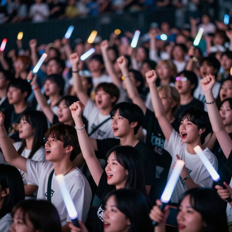 The image captures a vibrant and dynamic scene at a K-pop concert, where a loyal fanbase is immersed in the performance. The crowd, consisting of a diverse group of individuals, is filled with excitement and energy. Many fans are holding glow sticks, their bright colors illuminating the venue and creating a mesmerizing visual effect. The fans are seen in various poses, some with their arms raised high, fists clenched in the air, while others are dancing or singing along. The lighting is dramatic, with a mix of bright and dim spots that add depth and movement to the scene. The overall composition is tightly packed, with fans occupying almost the entire frame, creating a sense of unity and shared experience. The image is hyper-realistic, with exquisite detail that captures the intensity and passion of the moment. The fans are positioned in a way that suggests they are all part of a larger, cohesive group, united by their love for the music and the performers.
