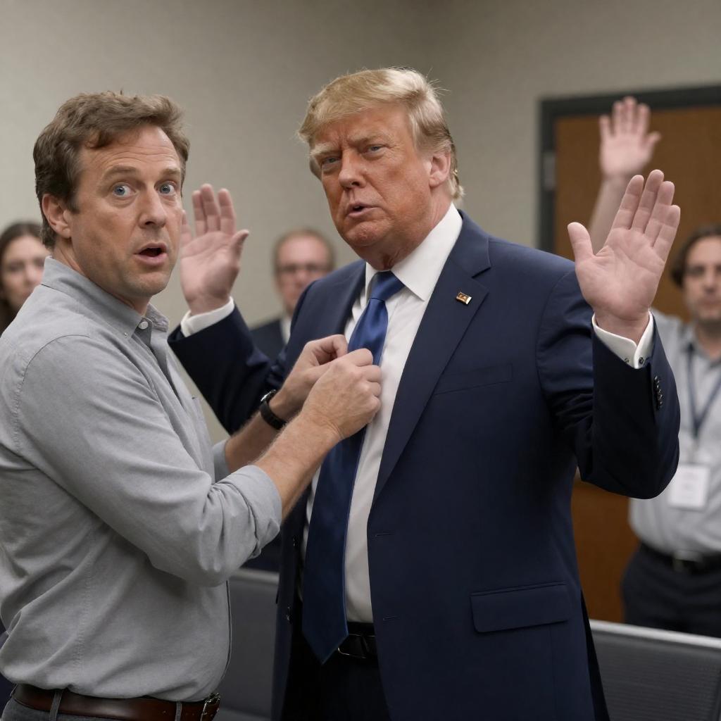 Photograph of two men in a room. Central figure with blond hair, blue suit, white shirt, intense expression, hands raised. Man on left, brown hair, gray shirt, surprised expression, adjusting central figure's tie. Background people with raised hands.