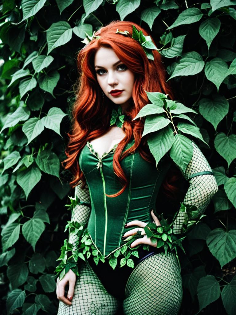 Portrait of a woman with red hair wearing a vintage green Poison Ivy cosplay costume adorned with leafy details, standing against a background of dense green foliage. The photorealistic image captures her confident expression and red lipstick, emphasizing the nature-inspired theme.