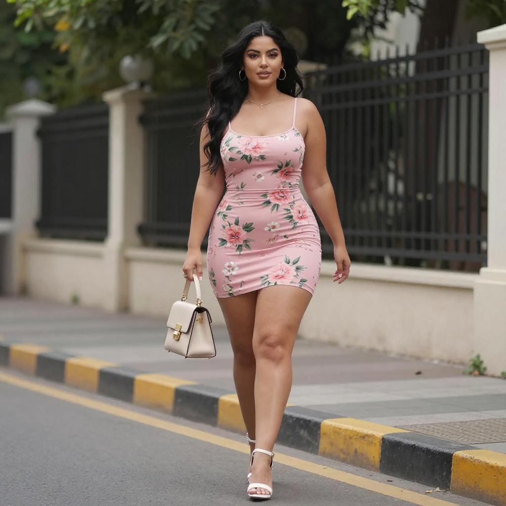 Photograph of a curvy woman with long black hair, wearing a tight, pink floral mini dress and white high-heeled sandals. She holds a beige handbag and stands on a sunny street beside a black and yellow curb, with a black fence and green trees in the background.