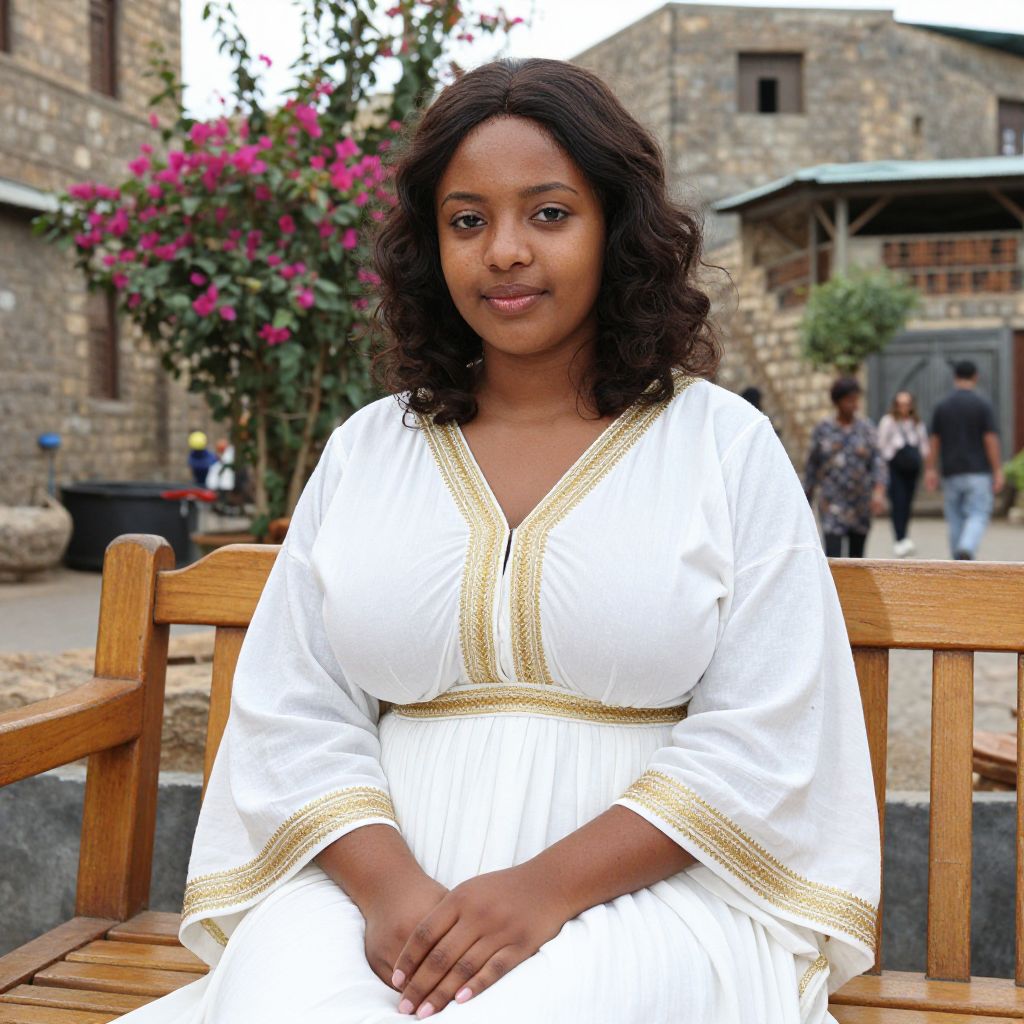 A candid, natural-looking portrait of an Ethiopian Habesha woman with a gentle expression, dark wavy hair styled loosely, dressed in a pristine white dress with elegant gold embroidery and border details, sitting on a wooden bench in a scenic urban courtyard of a historic neighborhood in Addis Ababa, surrounded by bougainvillea and traditional stone architecture.. The woman has big tits and cute face
