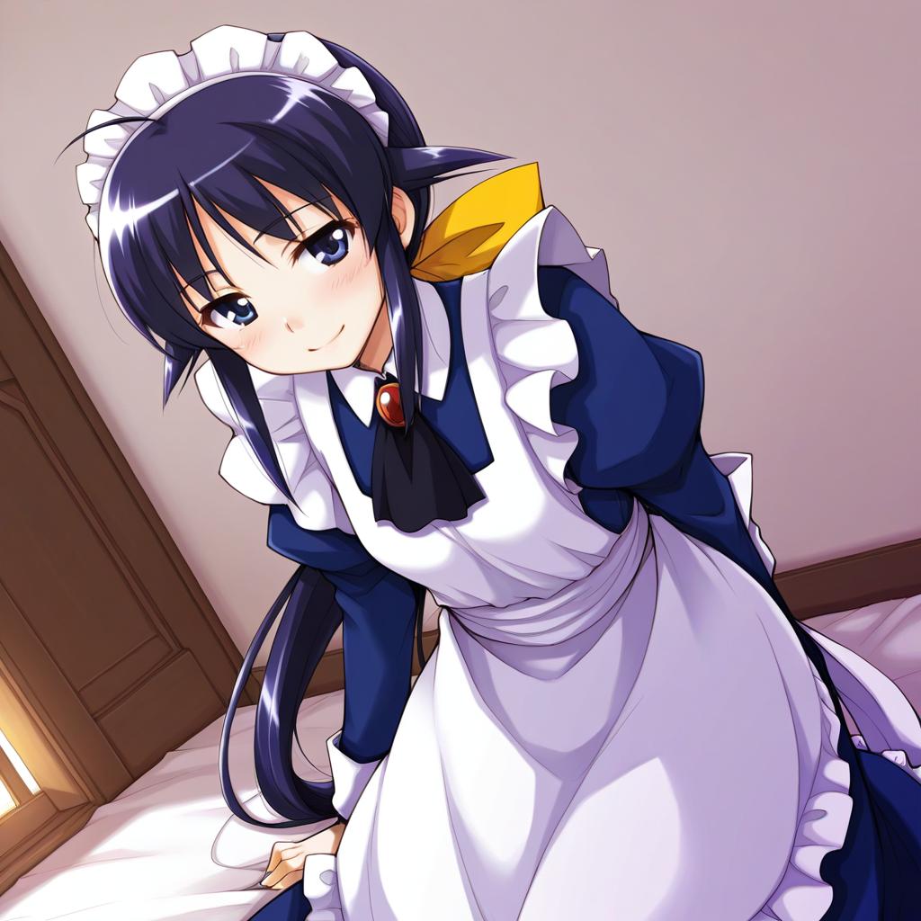 Andou mahoro, mahoromatic, 1girl, maid, maid, maid headdress, green eyes, long hair, blue hair, by artist ayakura juu, illustrious