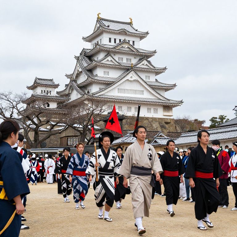 Photograph of a line of Japanese men in traditional white hakama and black headbands, marching down a street with traditional buildings in the background.