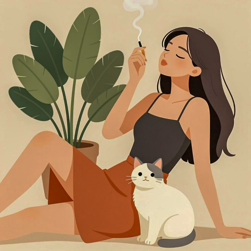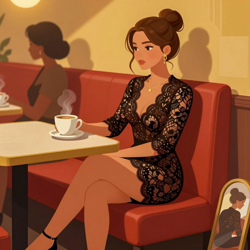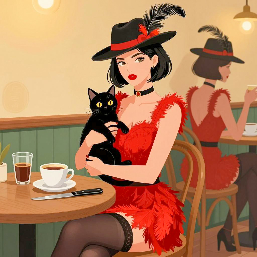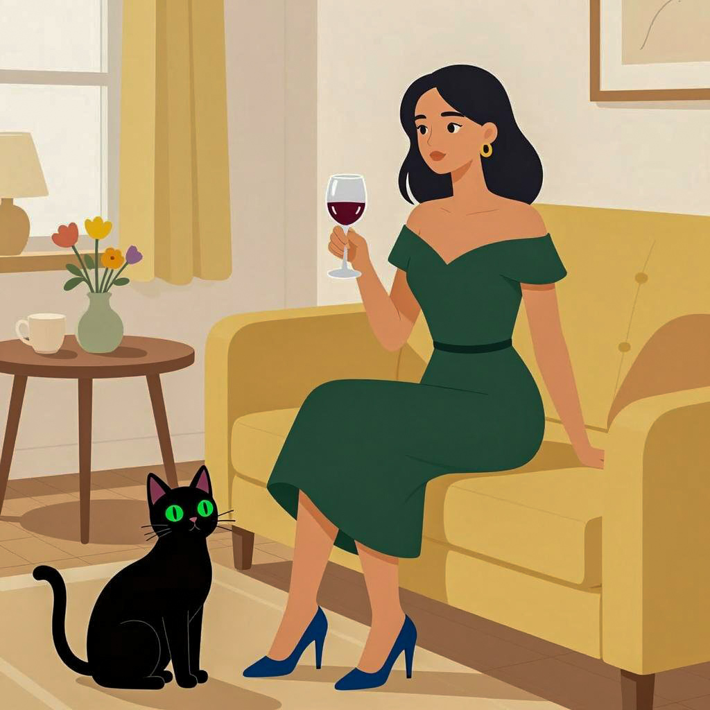 Illustration of a pale-skinned woman with red lipstick and brown hair in an updo, lying on an ornate, patterned couch. She wears a sheer, polka-dotted dress, red garter stockings, and a sparkling necklace. A black cat rests on her chest. Two hanging lamps with warm light, decorative pillows, a glass of wine, and a small stuffed rabbit are on the checkered floor. She has a relaxed expression. The background has geometric, Art Deco-style patterns.