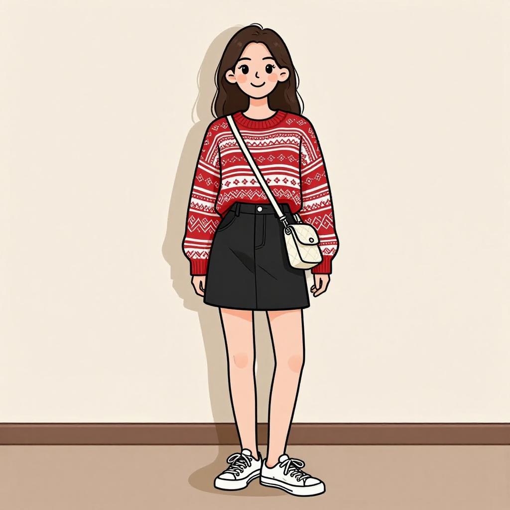 Woman with pretty face and pretty hair. smiling Woman, casual street style, marled knit cropped sweater in gray, round neckline, long sleeves, high-waisted pleated mini skirt in red with black and white plaid pattern, black ankle boots with medium heel, black leather backpack with zipper, studio background with a white seamless paper. --sref 1467