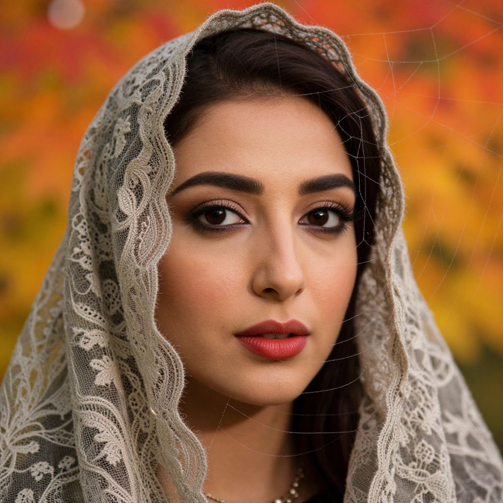 Create a photorealistic portrait in the style of fine art capturing the close-up visage of a Middle Eastern woman with her face partially veiled by delicate lace. Her enigmatic gaze is captured from an unusual perspective as if seen through a spider web highlighting the intricate details of her dark eyes and full lips subtly accented with a hint of red. The background blends vibrant autumn foliage in warm hues creating an emotional gradient that evokes mystery and introspection while celebrating nature's transitional beauty.