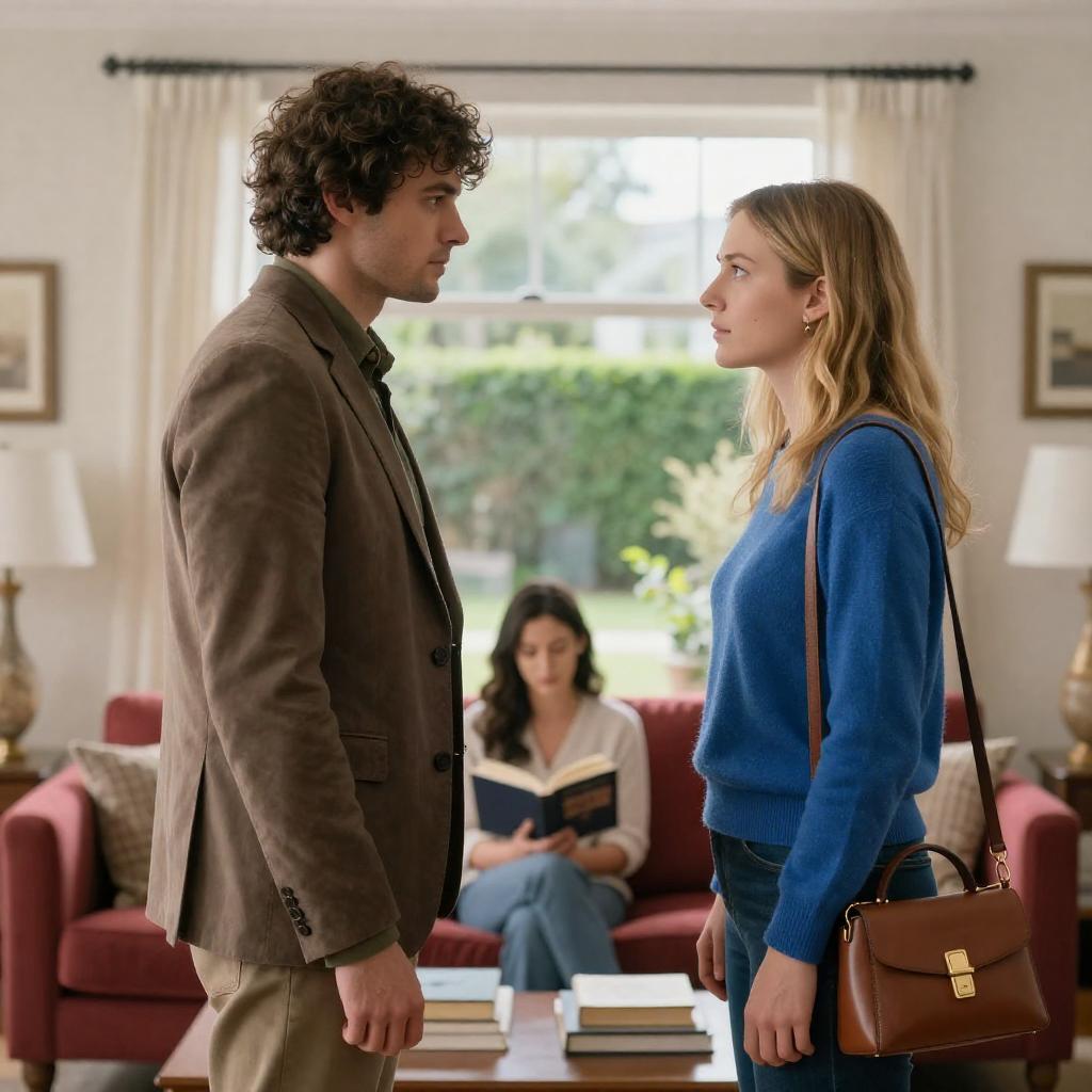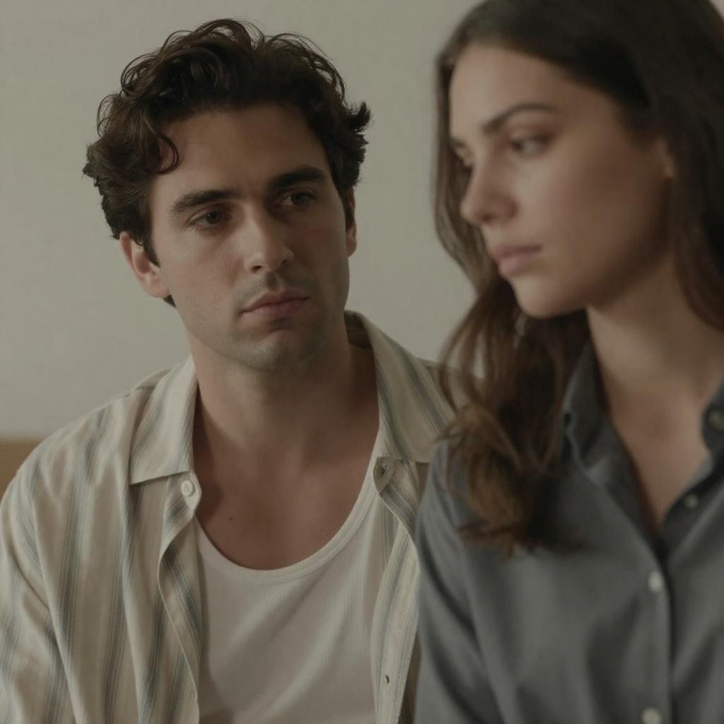 Movie still: two people, man and woman, sitting at outdoor café table with green director's chairs, man in white shirt, woman in pink sweater, both looking at each other, colorful patterned bag on table, white building with windows in background, bright daylight, casual conversation, relaxed posture.