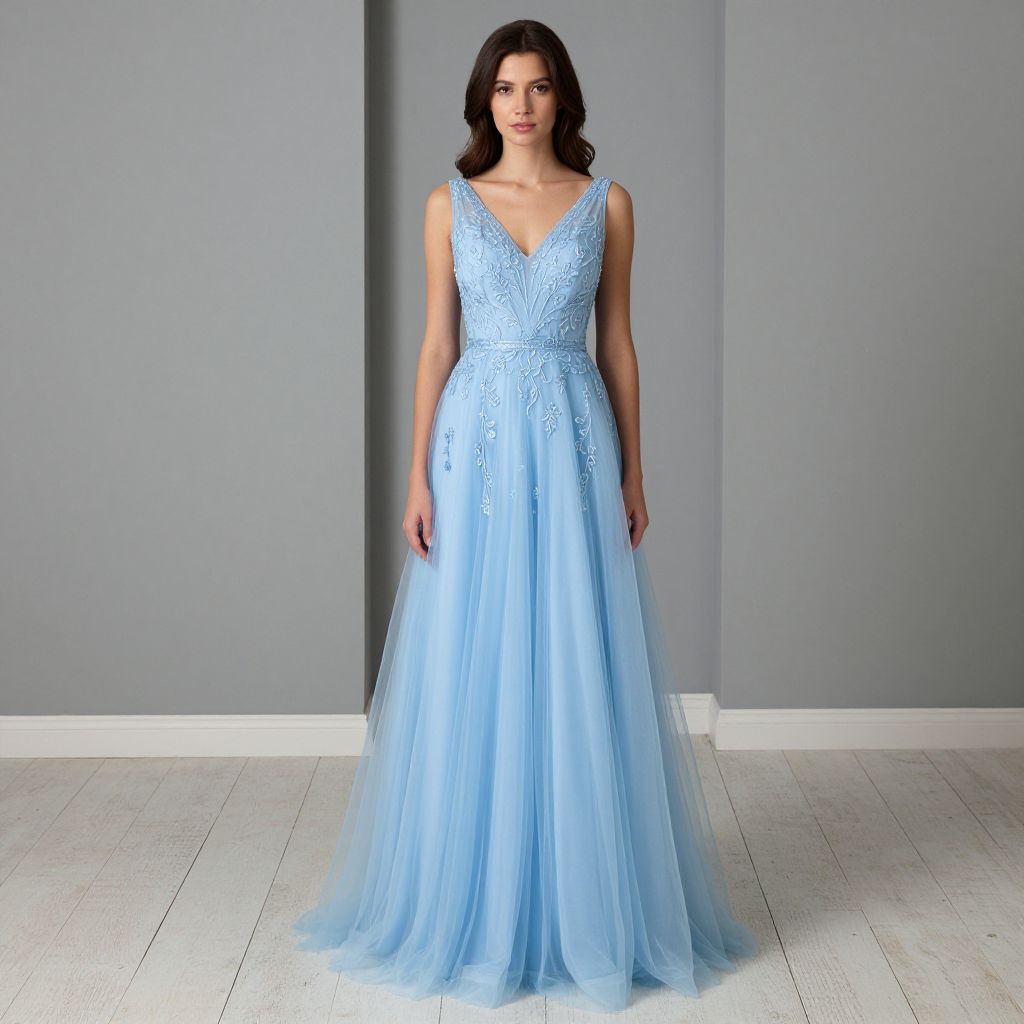 Elegant woman standing gracefully in a light blue A-line V-neck prom dress featuring intricate floral embroidery on the bodice and flowing tulle fabric cascading to the floor, set against a minimalist backdrop of gray walls and whitewashed wooden flooring.