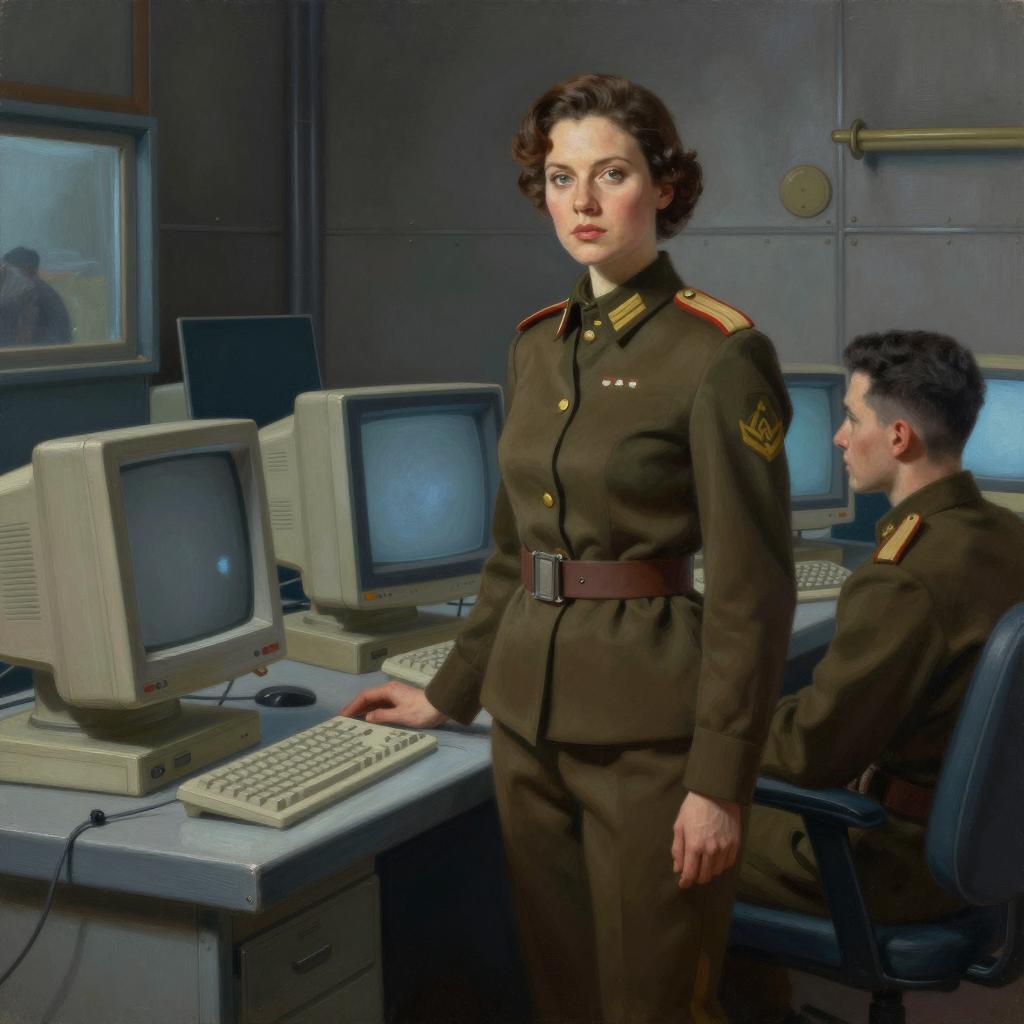 A woman dressed in a classic military uniform stands confidently in a dimly lit control room filled with vintage computer monitors emitting soft blue light. The room has an old, industrial feel with metallic walls and subdued lighting. Another figure in military attire is seated nearby, observing the screens. The scene is rendered in detailed oil painting style with cinematic lighting and a muted blue and brown color palette.