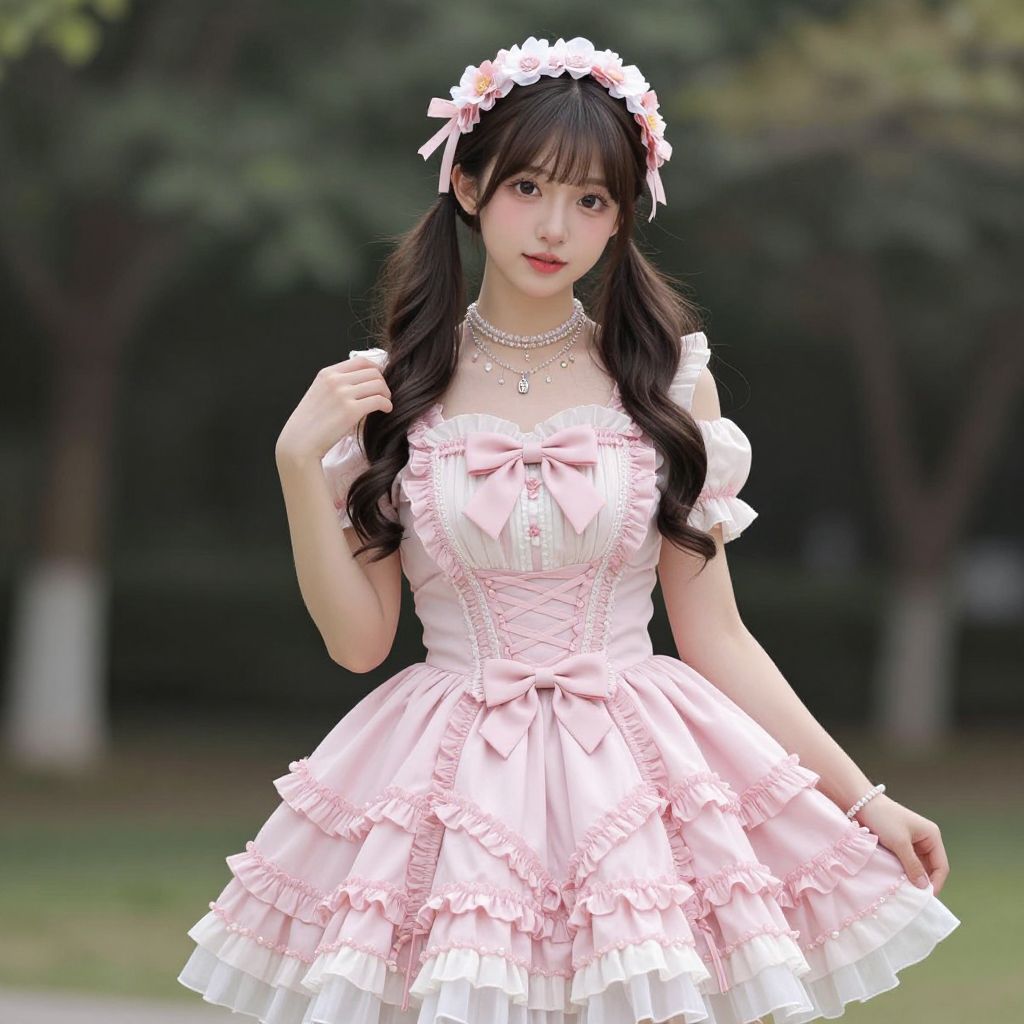 A high-definition digital illustration showcases a charming young woman adorned in an elegant pink Lolita dress featuring ruffled layers, a bow accent, and corset-style detailing, complemented by a floral headband and delicate jewelry, embodying the sweet and girly aesthetic of Kawaii Harajuku princess fashion.