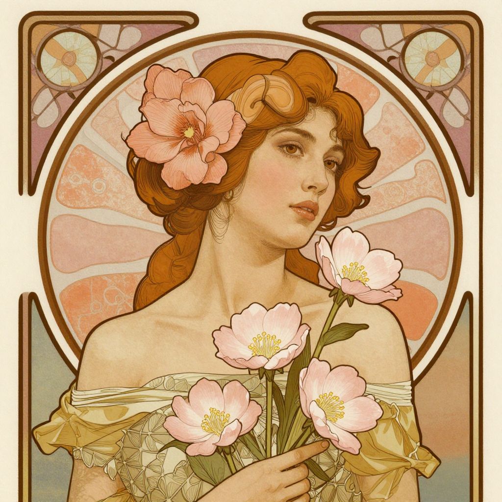 Art Nouveau-style digital illustration of a fair-skinned woman with curly red hair, adorned with a pink flower, holding pink peonies, wearing