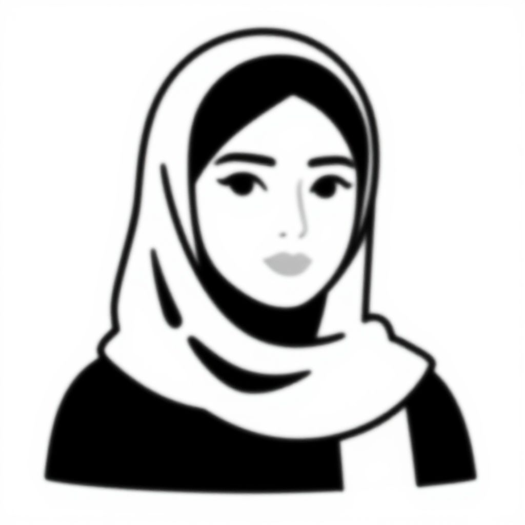 Black-and-white digital drawing of a woman wearing a headscarf, with simple, bold lines and minimal detail, featuring a neutral expression.