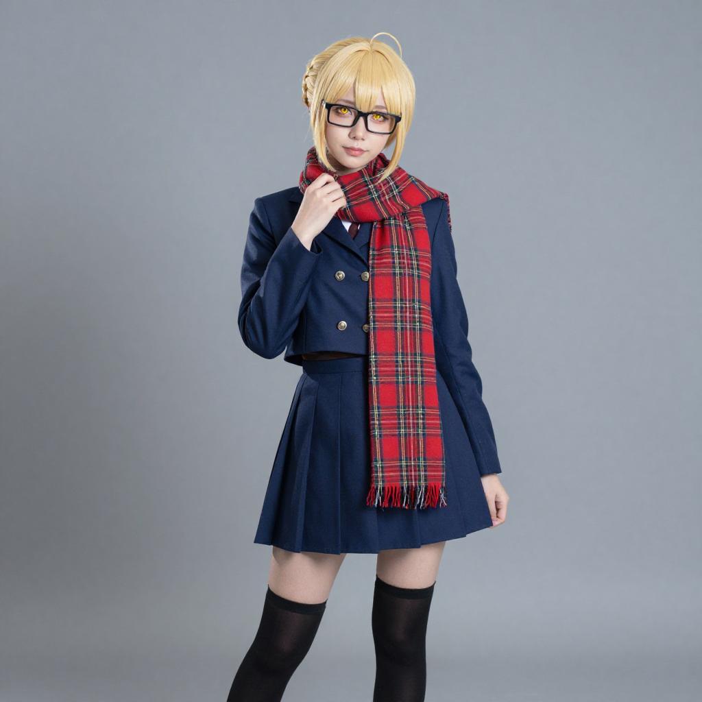 Photo-realistic cosplay photo of person in mysterious heroine x alter (first ascension) (fate) costume. Full body. Standing. Full length. 1girl, yellow eyes, hair between eyes, glasses, black-framed eyewear, under-rim eyewear, blonde hair, short hair, ahoge, sidelocks, braid, french braid, serafuku, red scarf, plaid scarf, blue skirt, pleated skirt, black thighhighs, long sleeves, professional photoshoot