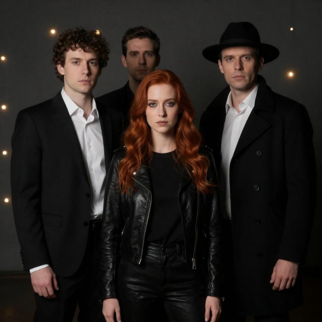Portrait of four adults posing in a dark, smoky environment. Front left features a serious man with dark hair wearing a white shirt, hand on chin. Center shows a sultry red-haired woman in a red dress. Front right is a man with a gray fedora and black suit. Back right is a man in a dark suit with a blue tie. The overall mood is intense and dramatic.