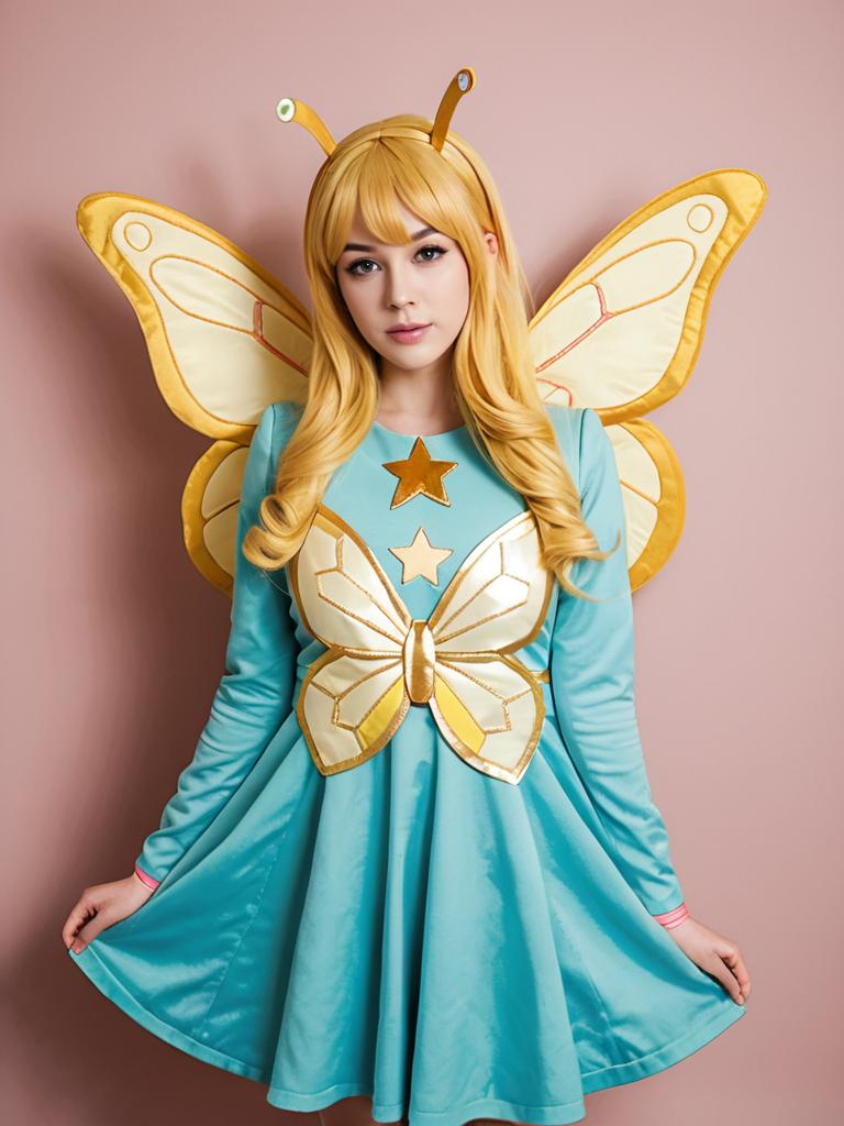 Woman cosplay. Wearing Star Butterfly costume. Realistic photo. Dressed as Star Butterfly --sref 1400