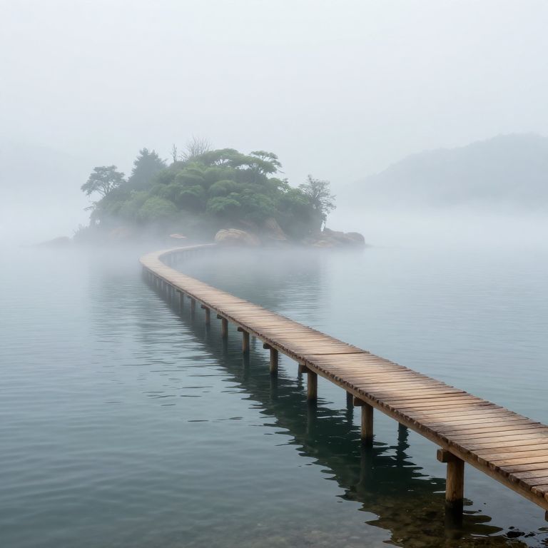 A serene 3D-rendered landscape captures a misty, ethereal scene where a wooden walkway extends across calm waters, connecting a fog-shrouded island to a distant shore, evoking the impressionistic ambiance of a dreamlike, ever-changing environment.