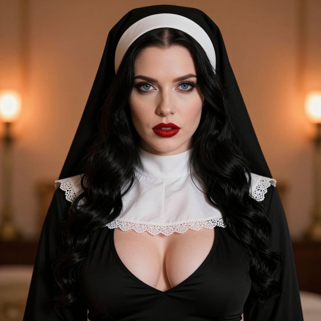 This is a digitally altered photo of a woman with pale skin, striking blue eyes, and long, wavy black hair wearing a black nun's habit with a white lace trim on her low-cut, revealing black top that highlights her large breasts. She has bold red lipstick and a serious expression. The background is softly blurred with warm orange lights.